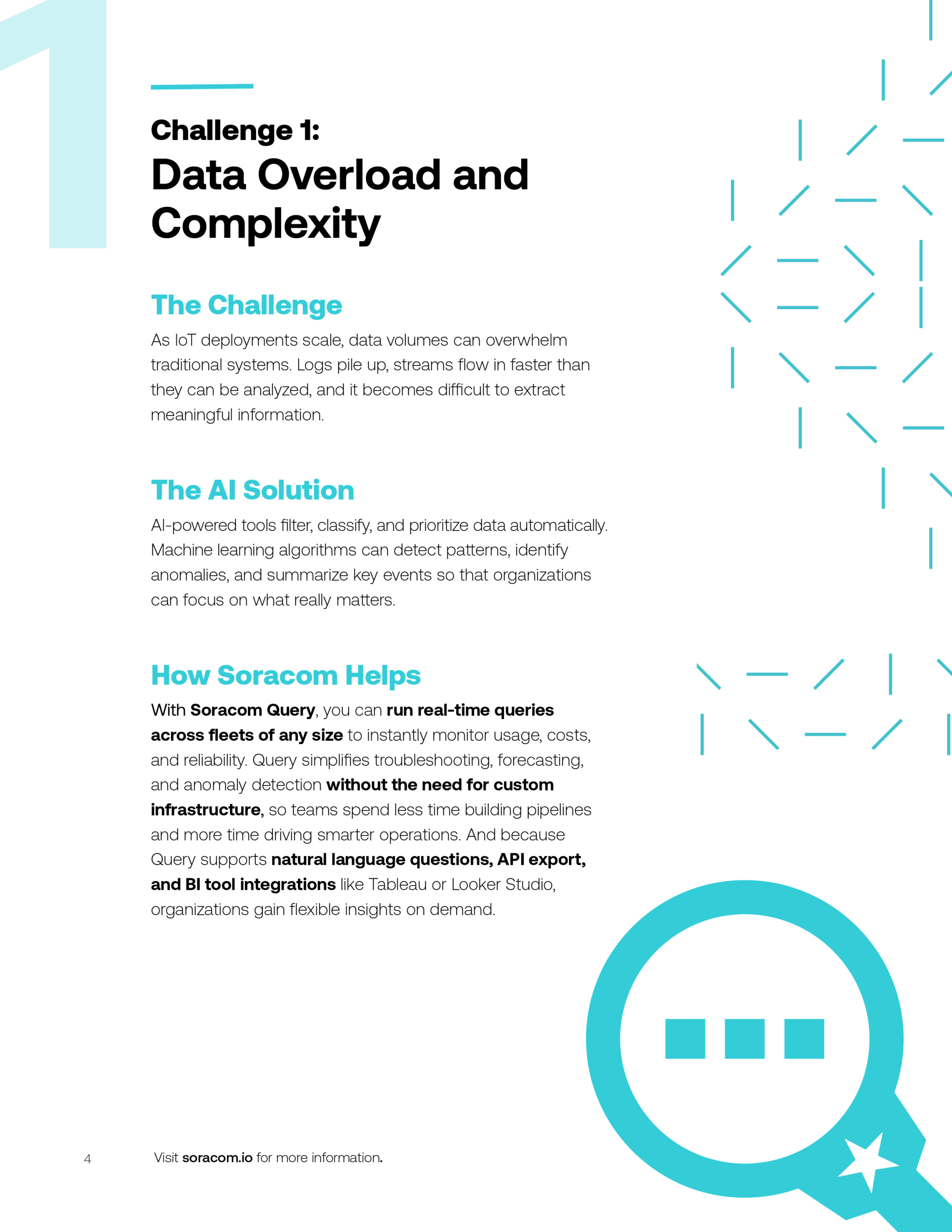 As IoT systems grow more complex, they generate enormous volumes of data that can quickly become unmanageable without the right tools. In this free eBook, 5 Common IoT Data Challenges (and How AI Solves Them), you’ll learn how AI-powered insights and automation can help you cut costs, improve visibility, and scale confidently – no matter how large your fleet becomes
