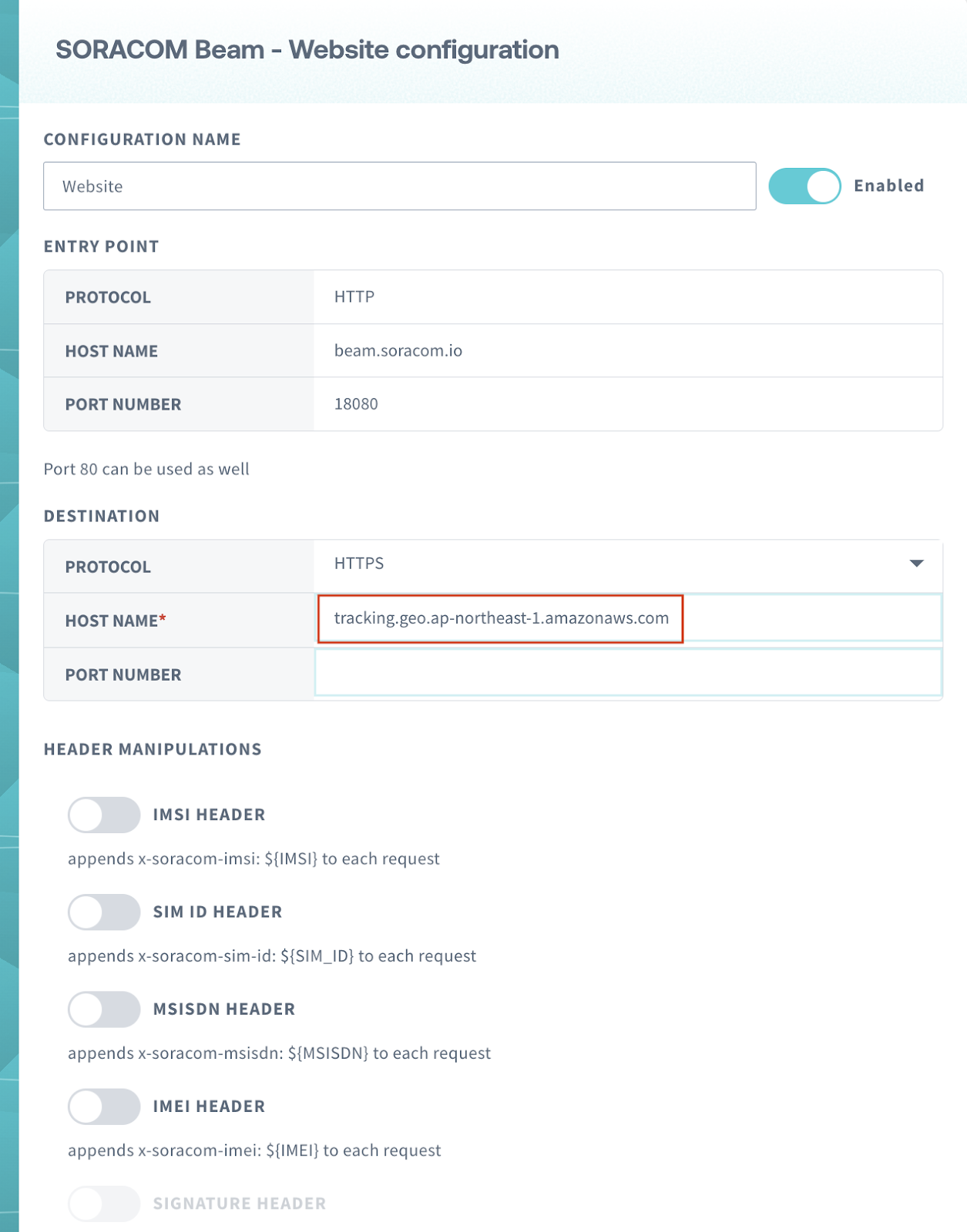 This should bring up the [Soracom Beam – Web Site Transfer Setting] screen.