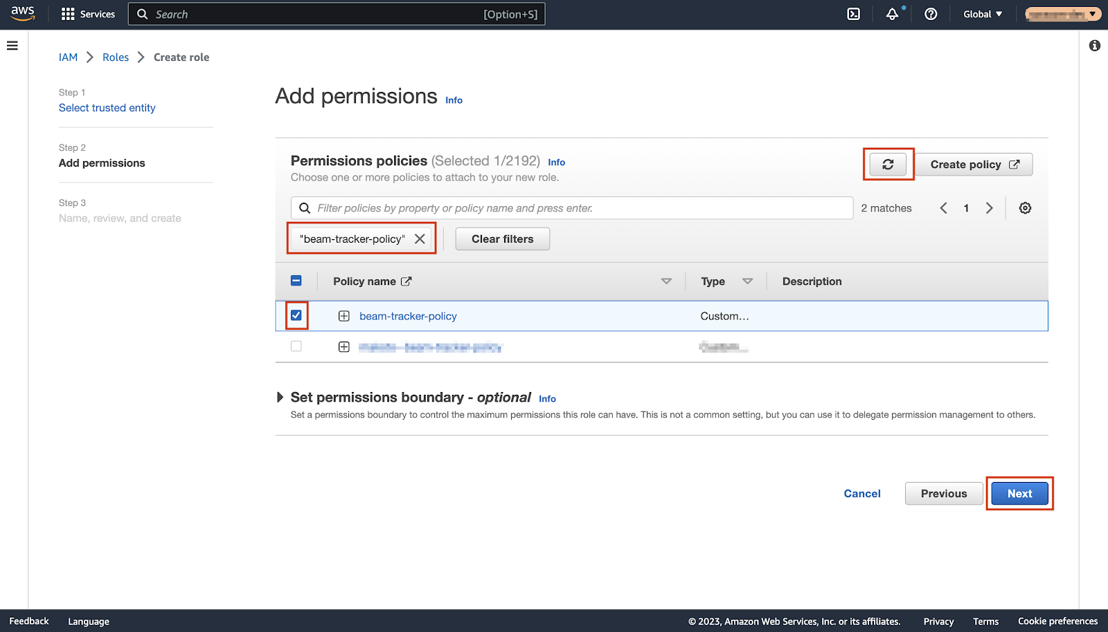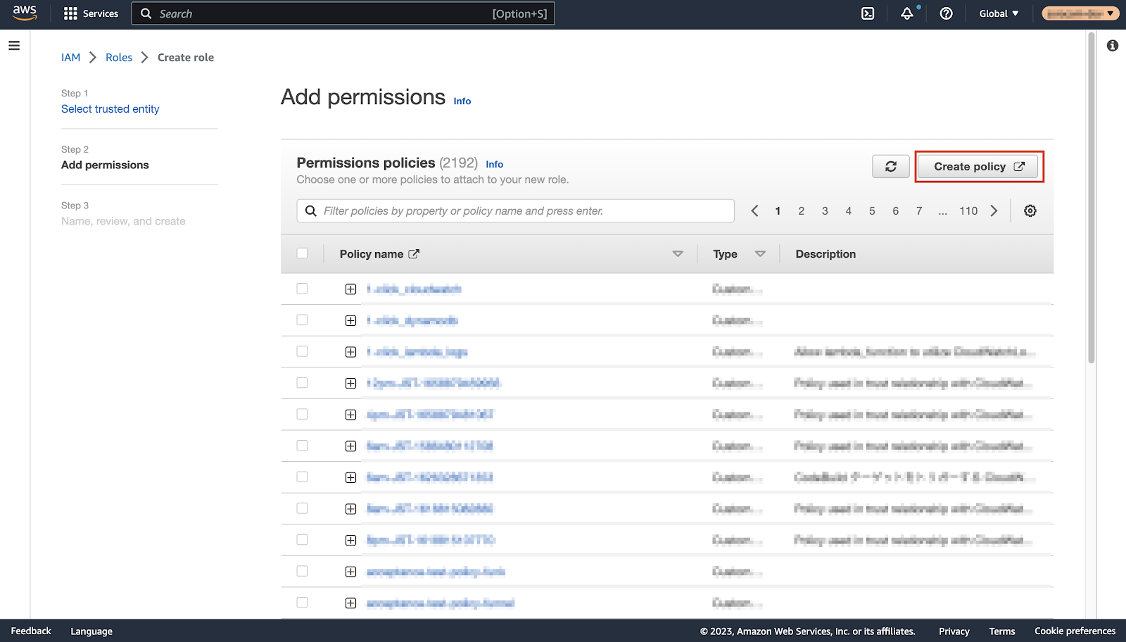 Once you have created the policy, go back to the [Add Permissions] screen where you started and continue creating the IAM role. Do not close the screen.