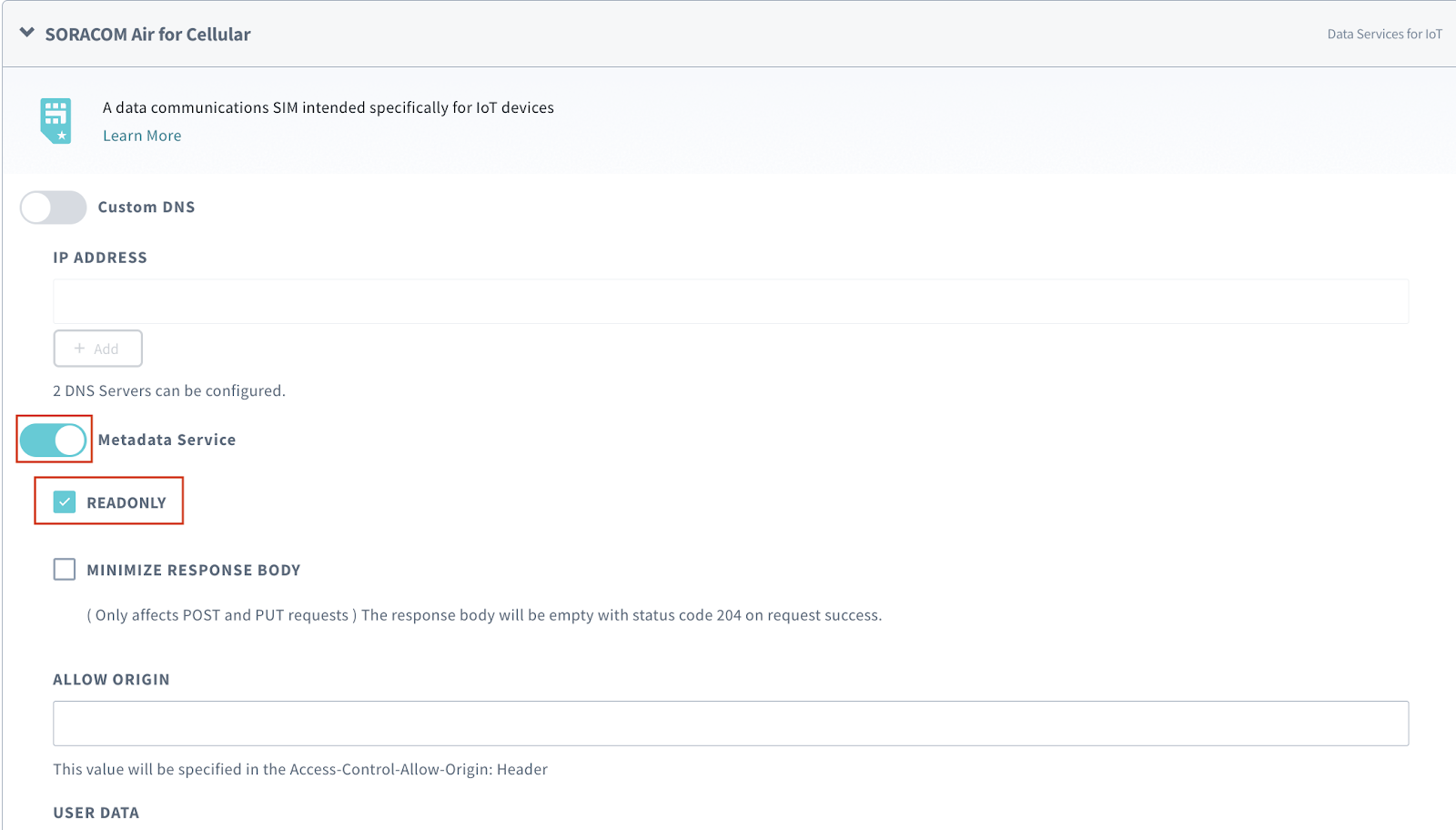 In the next steps, we will use Air’s metadata service to send data from the device to the AWS tracker. To do so, we must first enable Air’s metadata service for the group to which the IoT SIM belongs. For more information, see Setting up Metadata Service.