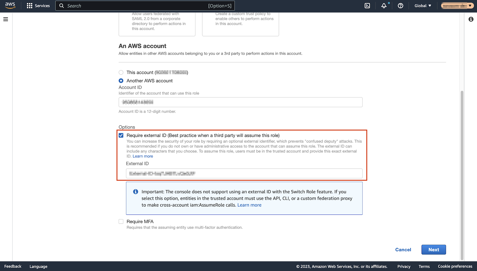 For more information on external IDs, please refer to “How to Use External IDs When Granting Access to AWS Resources to Third Parties – AWS Identity and Access Management” in AWS.
