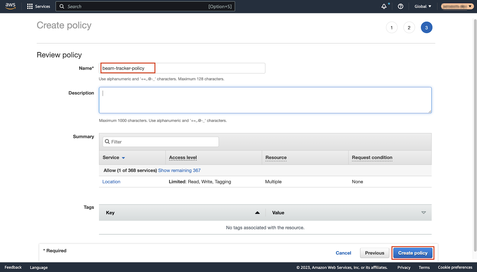 Create a tracker named “beam-tracker” in AWS Tracking.