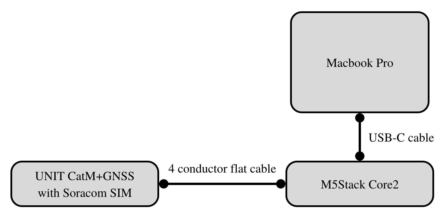 First, connect the M5 Core2 to the UNIT CatM+GNSS with a flat cable, and then to your computer with a USB-C cable.