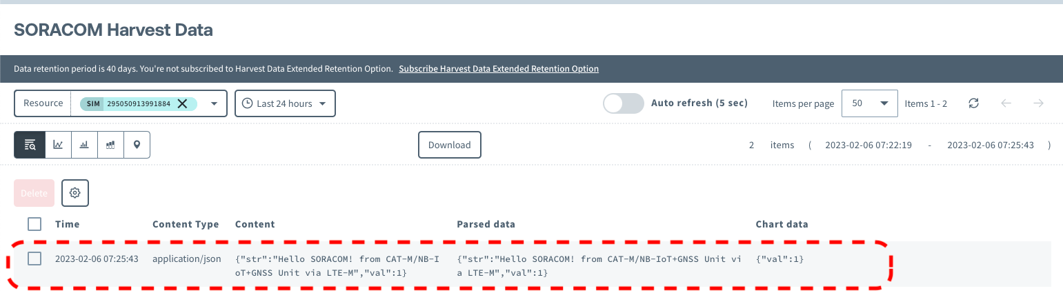 Once the code has sent JSON data to Soracom Harvest and the connection is properly established, you should be able to check the data from the console.