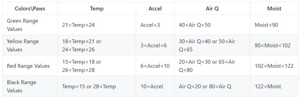 For easy understanding and viewing of the pet’s conditions, the web interface was color-coded for easy understanding of the pet’s environment. For example, green indicated ideal range values for a pet’s comfort and well-being, while red indicated distressing conditions.