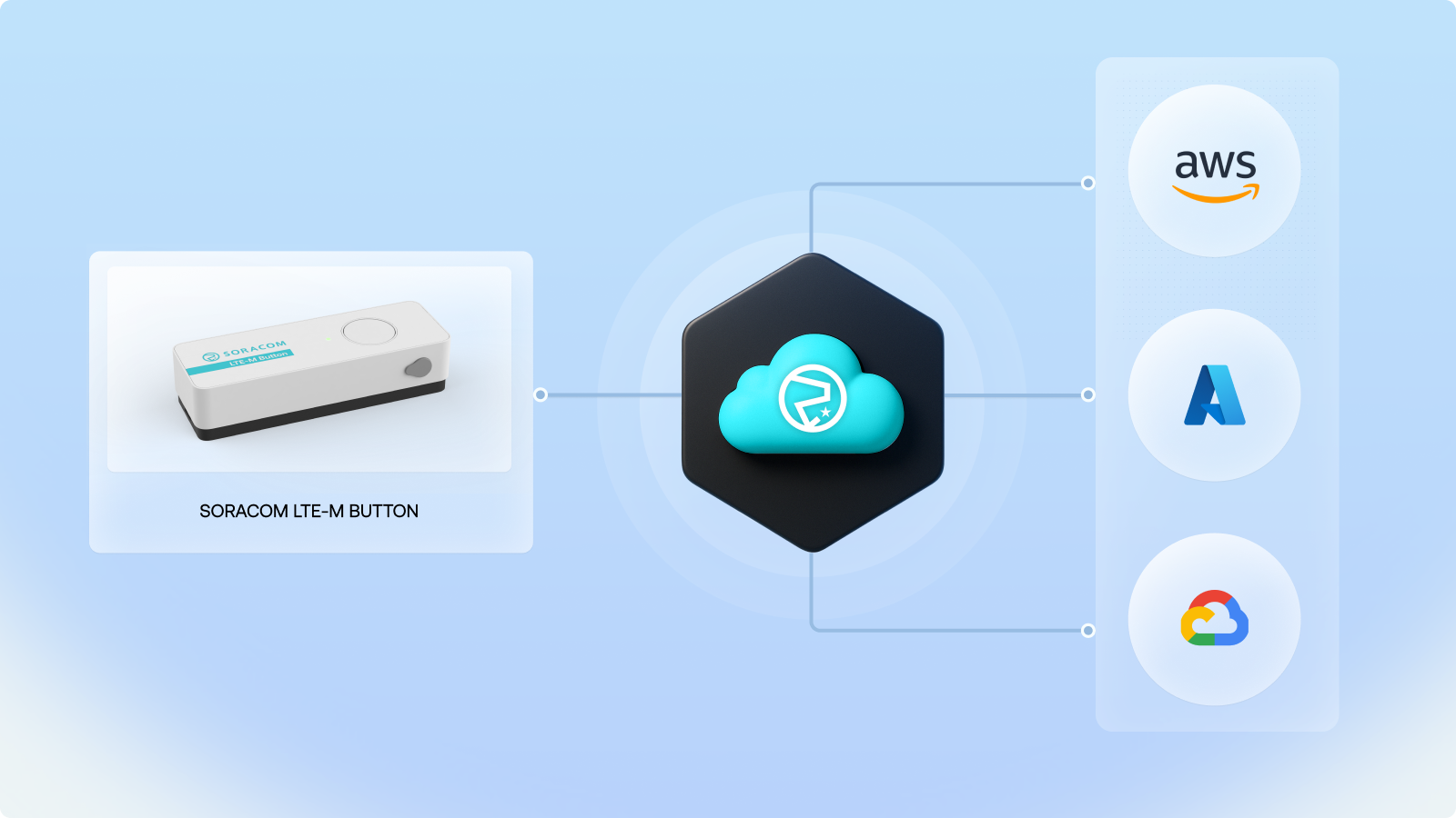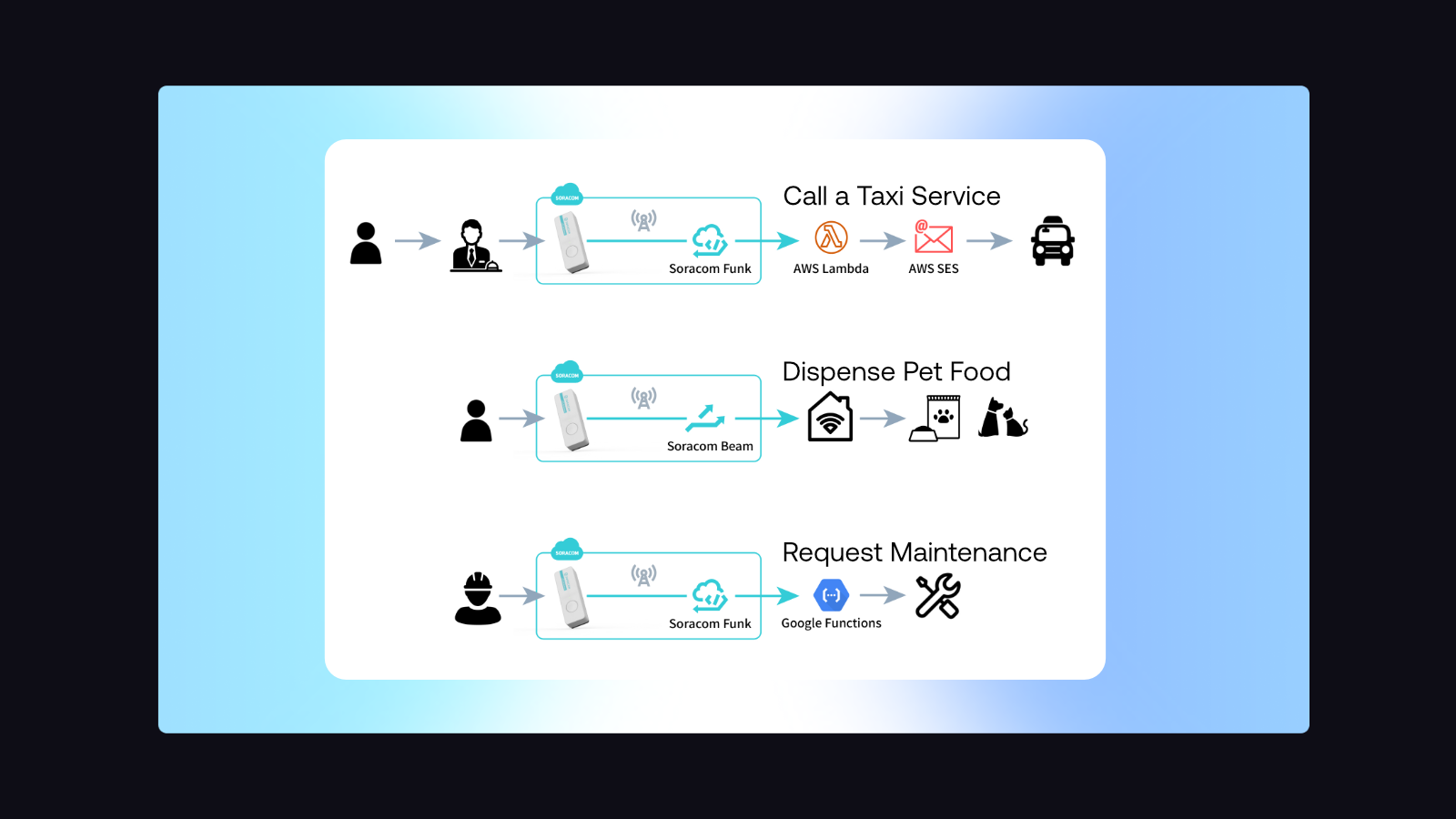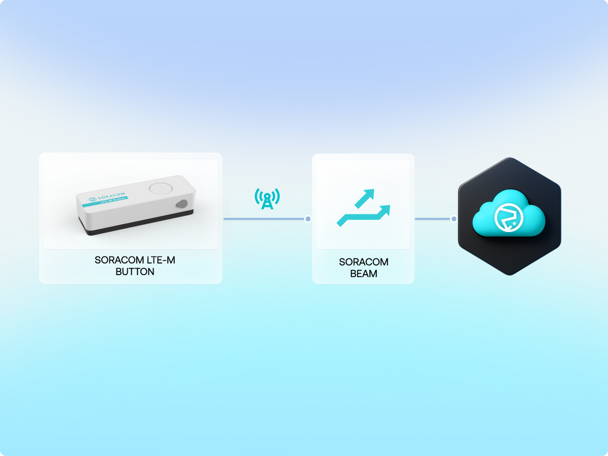 Send button events through Soracom Beam, Funnel, or Funk to webhooks, APIs, or serverless functions.
