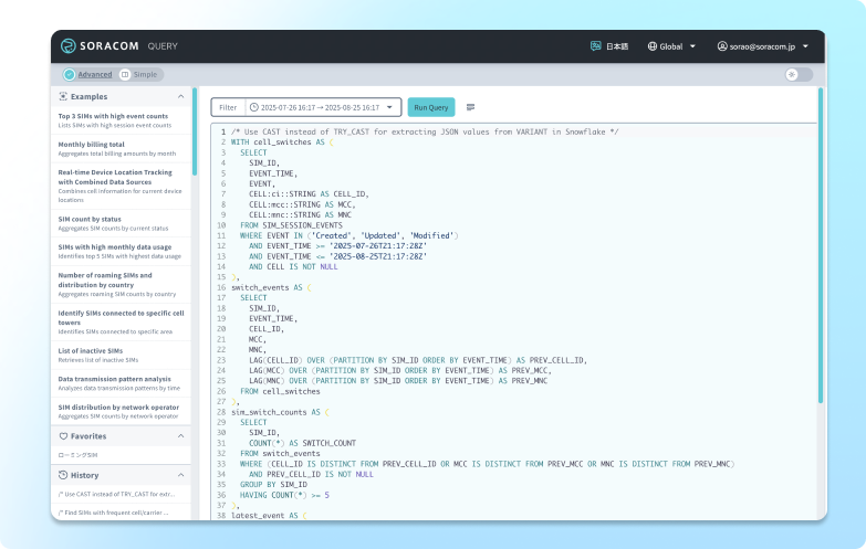 Soracom Query is a reporting and analytics service that lets you investigate SIM, connectivity, billing, and device data using natural language or SQL-style queries powered by a Snowflake data warehouse.