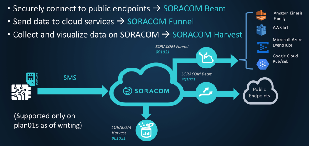 When sending data from the device to the cloud, SORACOM Beam is used to connect to a public endpoint securely. SORACOM Funnel provides an adapter for transferring data to various cloud services, including Amazon Web Services (AWS), Google Cloud Platform (GCP), and Microsoft Azure. SORACOM Harvest is a service that collects and visualizes data. Each of these now supports receiving data by SMS messages from a device.