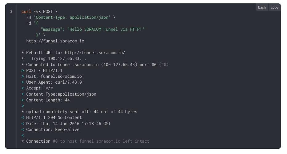 (note, I used the Soracom ARC service, which allows me to create a virtual SIM that allows me to connect to the Soracom cellular network with my Mac using Wireguard. This way, I can just open a terminal window and enter the data to send through the network, emulating a cellular device connection.)