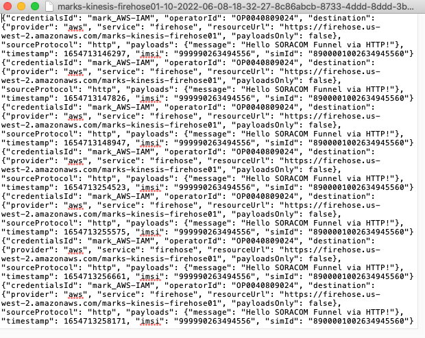 It’s Working! The data is in the AWS S3 bucket and includes the simID, identifying the individual IoT device.